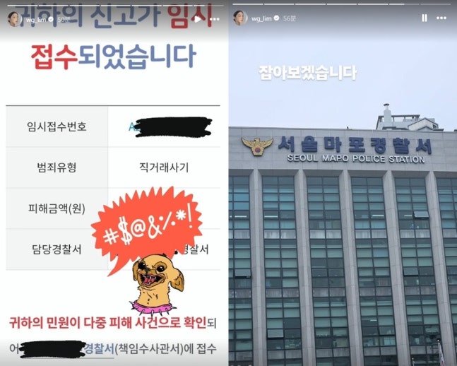 혜림은 9일 인스타그램 스토리에 “잡아보겠습니다“라는 글과 서울마포경찰서 전경 사진을 올렸다. 이어 사기 피해 접수 내용도 공개했다. 혜림은 온라인을 통한 직거래 과정에서 사기 피해를 입은 것으로 보인다.