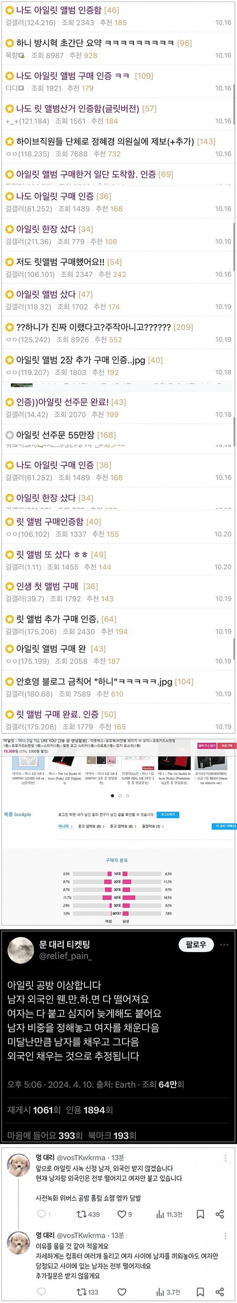 아일릿 담구려고 일부러 아저씨들이 빠는 팬덤인 것처럼 몰아가고 각종 연예인들 악플 다 아일릿, 르세라핌 팬들이 쓴 것처럼 선동한거 진심 개웃 진짜 그 팬덤은 뇌피셜을 어디까지 퍼뜨리고 다닌 거임 거기에 좋다고 같이 동조한 것들도 한심함 아기 다이브 수준으로 릿도 어린 애들이 좋아하더라구요 토끼단들아ㅜㅜ 근데 니네 팬덤이야말로 꾸짖을 갈 ㅈㄴ 하고 다니는게 1호선 개저 같음ㅜㅜㅜㅜ