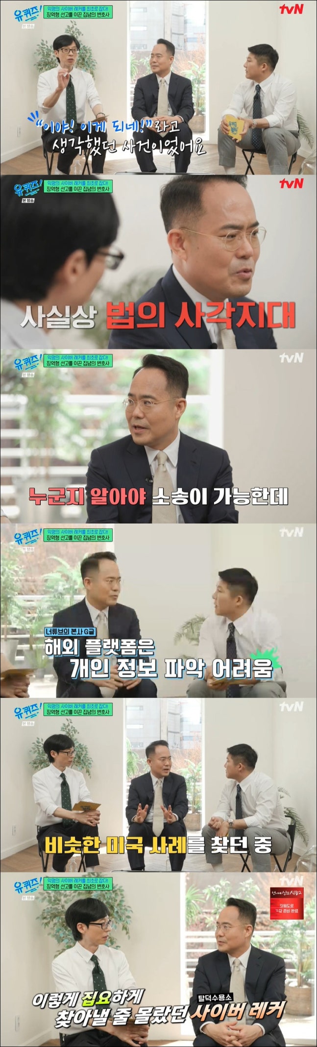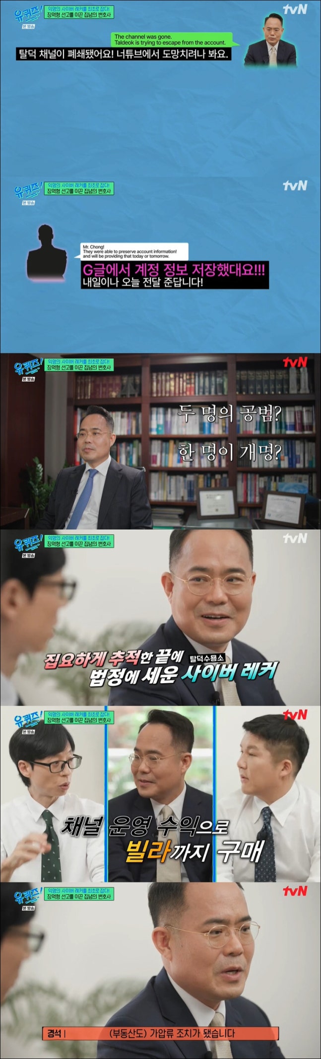 유재석 역시 "'이게 되네?'라고 생각했던 사건이다. 예전에는 잡기가 힘들었다고 들었다"고 밝혔고 정경석 변호사는 "거의 불가능하다고 봤다. 운영하는 사람이 누군지 몰라서 더 고통스러워했고 어떻게 보면 법의 사각지대에 있다. 채널 운영하는 사람들도 못 잡겠지 싶었을 것"이라 밝혔다.