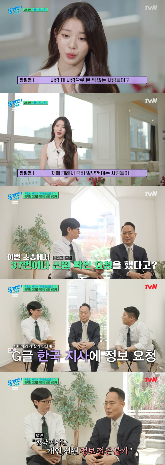 /사진=tvN 방송화면정 변호사는 "사이버 레커들은 익명성이 강한 만큼 대부분 소송을 중도 포기하는 경우가 많다. 이번 소송에서 37번이나 신원 확인을 요청했다. 그런데 다 실패로 돌아갔다"고 말했다.이어 "구글 한국 지사에 (사이버 레커에 대한) 정보를 요청하면 미국 본사로 연락하라고 한다. 여러 노력을 하다가 구글 미국 본사에 이메일을 보내서 요청했는데 미국 법원 명령이 있어야 개인 정보 공개 가능이라는 회신을 받았다"고 설명했다.