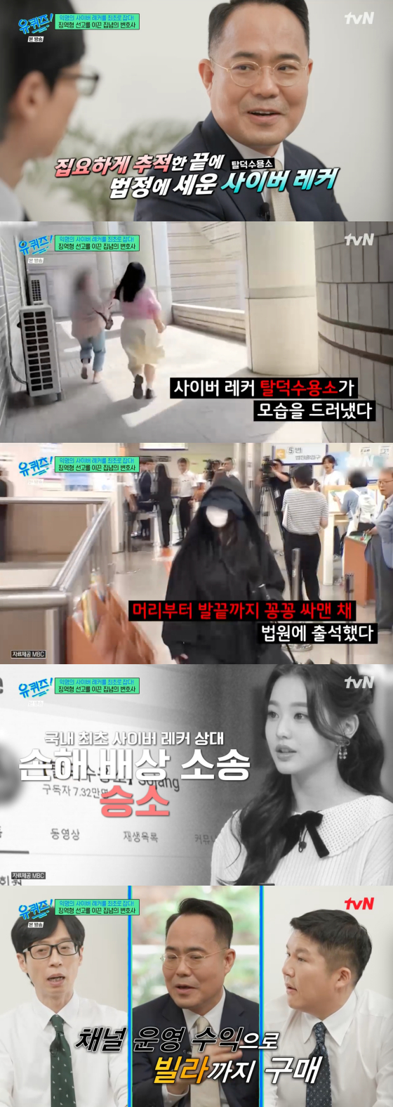 /사진=tvN 방송화면정 변호사는 "성취감을 느꼈다. 누구도 잡지 못했던 익명의 사이버 레커를 법정에 세웠기 때문"이라며 미소를 지었다.장원영 측은 국내 최초 사이버 레커 상대 손해 배상 소송에서 승소했다. 1억 원 배상 판결에 탈덕수용소는 항소를 했다. 항소심에서는 최종 5천만 원으로 감액됐고, 현재 회수 중이다. 가짜 뉴스로 번 그동안의 수익금도 추징 중이라고.