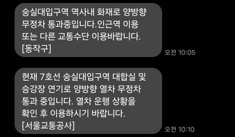 서울 지하 7호선 숭실대입구역 역사에서 화재가 발생해 현재 양방향 열차가 무정차 통과되고 있습니다.