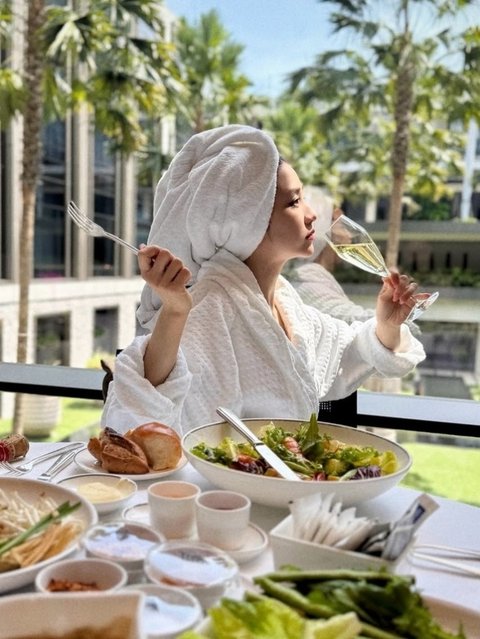 공개된 사진 속 박하선은 샤워가운만 입고 식사를 즐기고 있다. 아름다운 숙소 뷰를 뒤로 둔 채 머리에 바쓰타올을 얹고 샴페인을 기울이는 박하선의 모습에선 여유롭고 럭셔리한 분위기가 가득하다. 다만 바쓰타올이 너무 무거웠는지 금세 이를 벗어던지는 박하선의 털털한 모습이 웃음을 자아낸다.