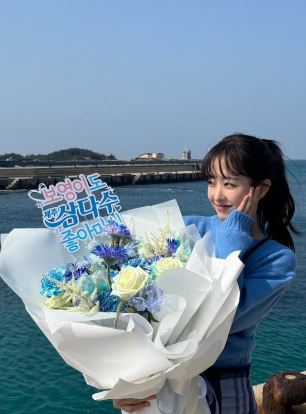 공개된 사진에서 박보영은 삼다수 인형을 들거나 '보영이도 제주삼다수 좋아마심'이라는 토퍼가 눈에 띄는 꽃다발을 들고 포즈를 취하고 있다.