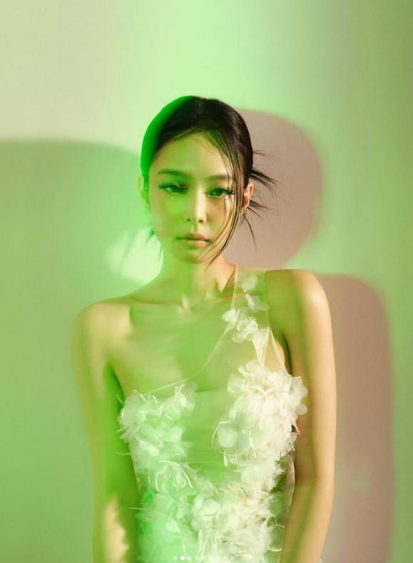 화보에서 제니는 시스루 슬림 원피스를 입는가 하면, 연두색 블라우스와 재킷을 입고 봄의 상큼한 분위기를 전했다.