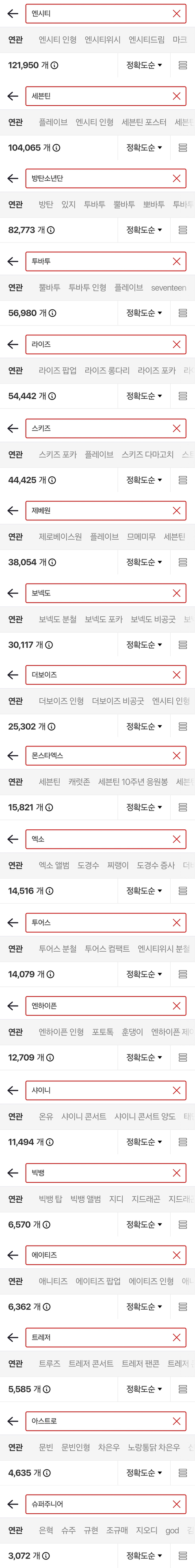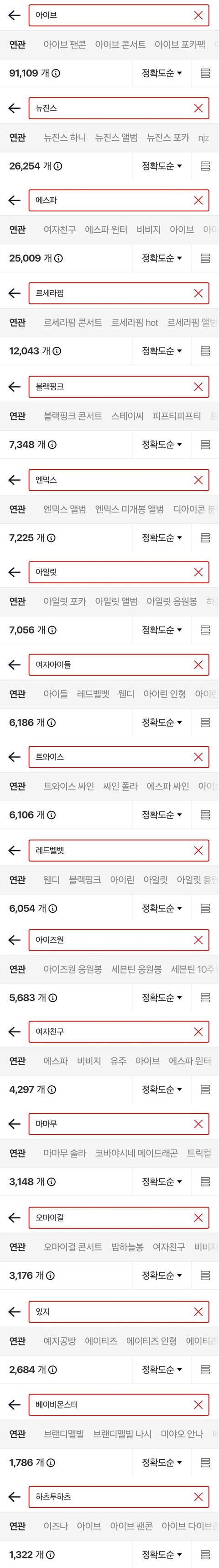 엔시티, 세븐틴, 방탄, 투바투, 라이즈, 스키즈, 제베원, 보넥도, 더보이즈, 몬스타엑스, 엑소, 투어스, 엔하이픈, 샤이니, 빅뱅, 에이티즈, 트레저, 아스트로, 아이브, 뉴진스, 에스파, 르세라핌, 블랙핑크, 엔믹스, 아일릿, 여자아이들, 트와이스, 레드벨벳, 아이즈원, 여자친구, 마마무, 오마이걸, 있지, 베이비몬스터, 하츠투하츠,
