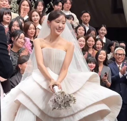 가장 먼저 눈길을 끈 건 효민의 웨딩드레스였다. 본식 1부에서 입은 드레스는 국내에 단 두 벌뿐인 희소한 디자인으로 알려졌으며, 고급스럽고 화려한 레이스 디테일과 실루엣으로 시선을 사로잡았다. 2부에서는 심플하면서도 우아한 드레스로 분위기를 바꿔, 효민만의 절제된 아름다움을 완성했다.