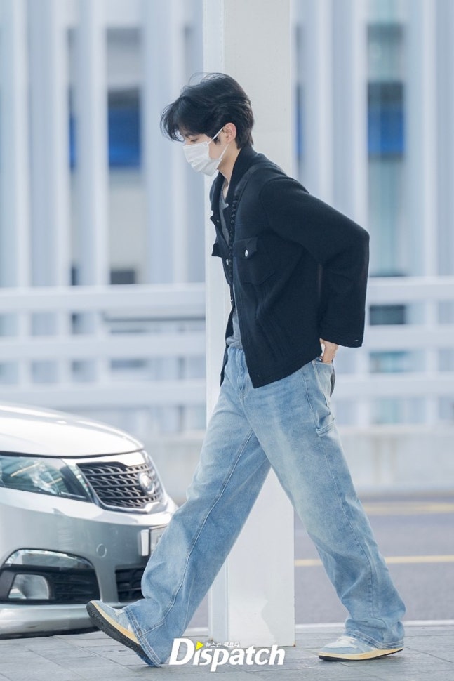 유우시는 블랙 가디건과 데님 팬츠로 멋을 냈다. 잘생긴 비주얼이 돋보였다.