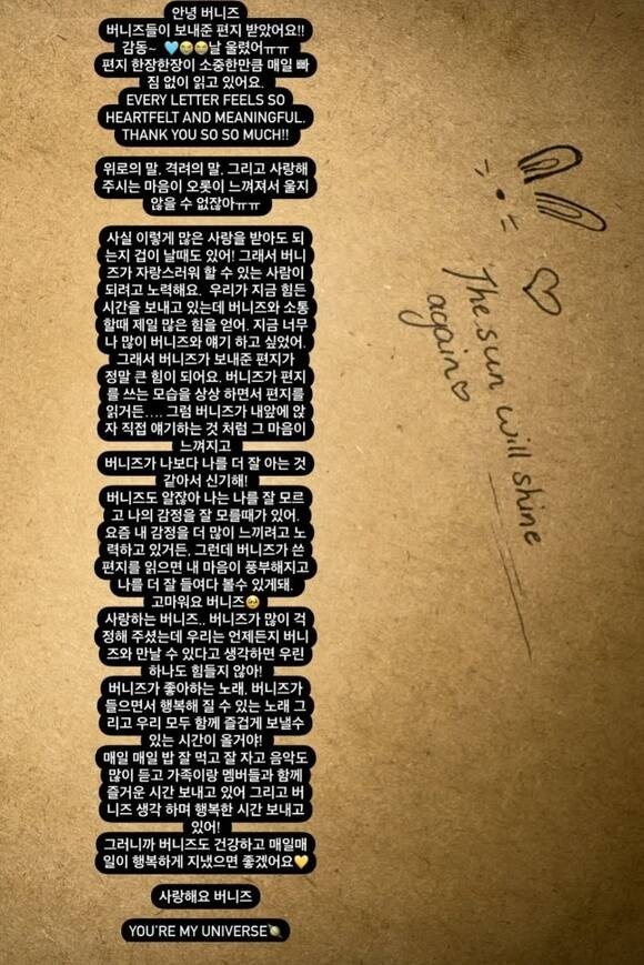 멤버들은 "위로의 말, 격려의 말, 그리고 사랑해 주시는 마음이 오롯이 느껴져셔 울지 않을 수 없잖아"라며 "버니즈가 자랑스러워 할 수 있는 사람이 되려고 노력한다. 우리가 지금 힘든 시간을 보내고 있는데 버니즈와 소통할 때 제일 많은 힘을 얻어. 그래서 버니즈가 보내준 편지가 정말 큰 힘이 돼"라고 고마운 마음을 전했다.