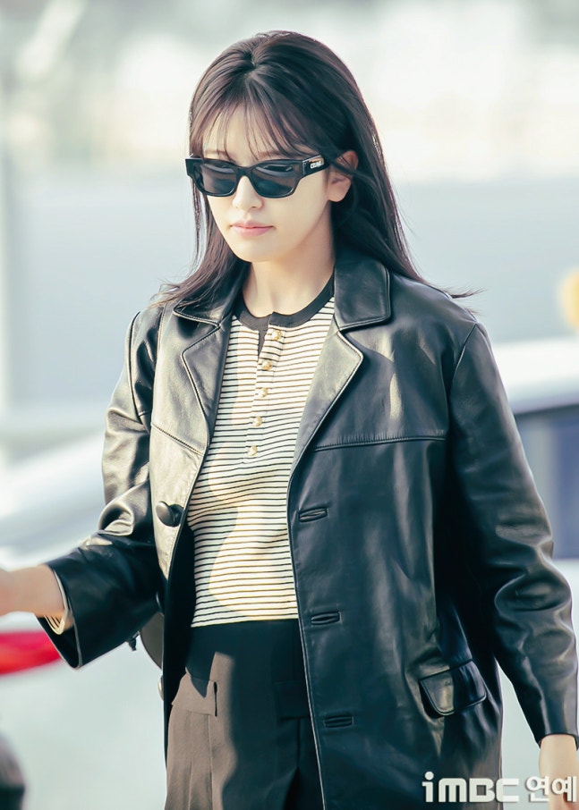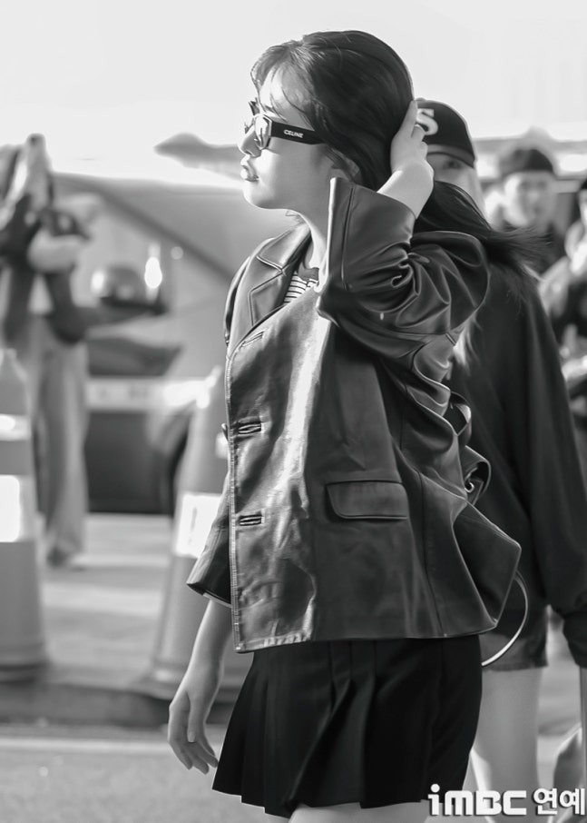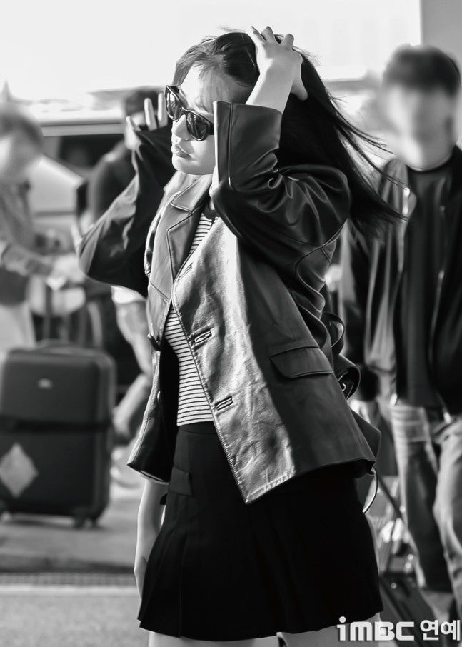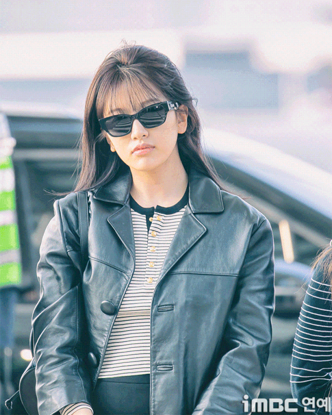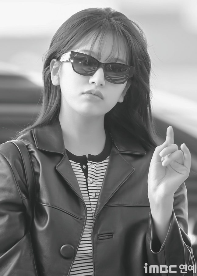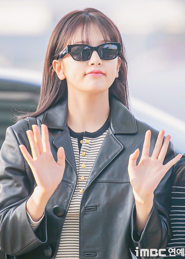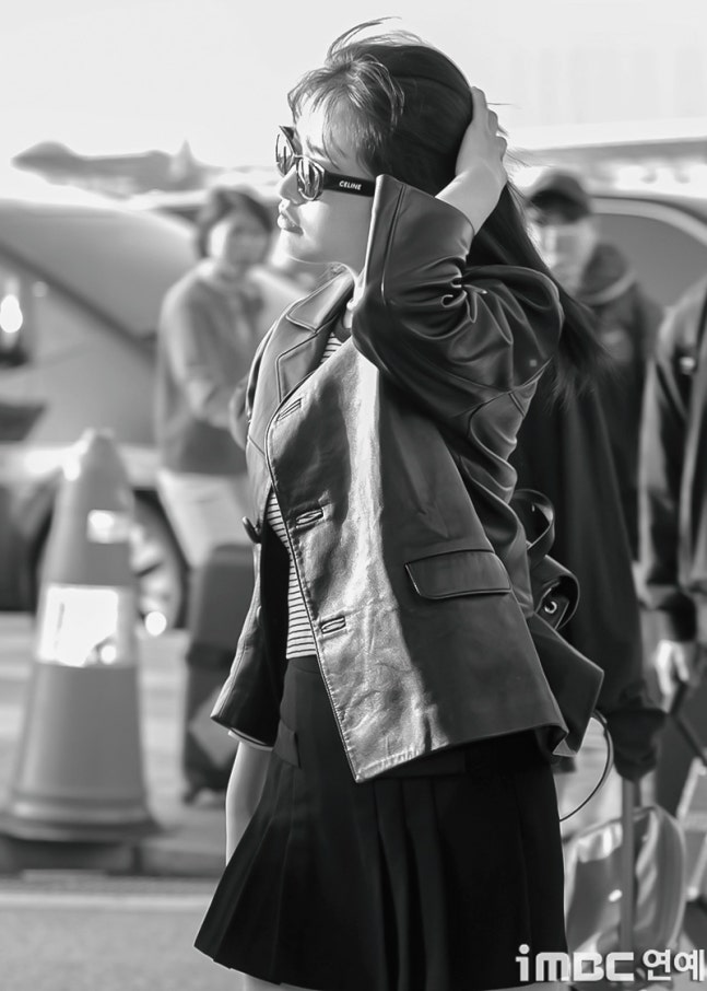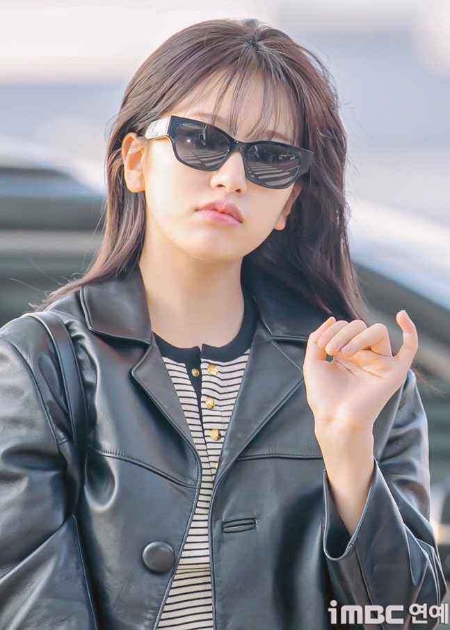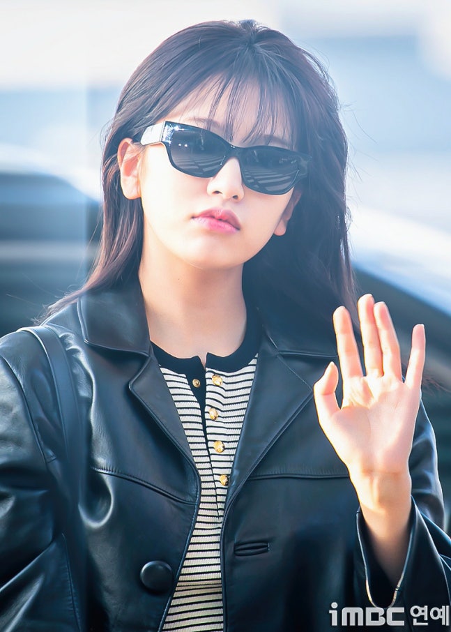 유진. 안유진이 이른 아침부터 선글라스와 가죽 재킷으로 인천 제1 여객터미널에서 '터미널2터' 포스를 뽐내며 '안유델'의 면모를 과시했다.