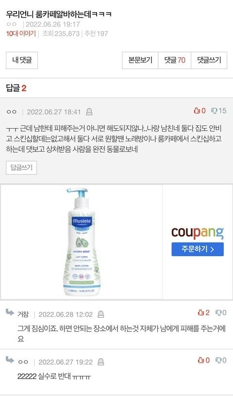 손잡고 영화보고 장난치는 스킨쉽가지고 누가 뭐라하냐 그안에서 성관계하고 키스하고 하악하악 소리들리니까 하는소린데 진짜 판자때기 하나두고 그러고 있으면 동물이랑 뭐가다른데