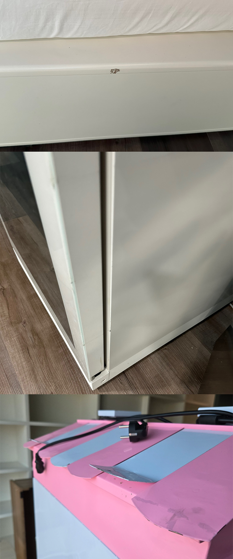 고가라고 이야기했던 의자 두 개가 등판 쪽에 찢어져 있었고 다리는 긁혀서 도색이 벗겨지고 냉장고는 문이 찍혔고, 흠집이 났으며 식탁의자 또한 도색이 벗겨졌더라고요 인형 뽑기 기계가 있는데 철판이 휘어있고, 침대 프레임은 나무가 떨어져 나갔어요
