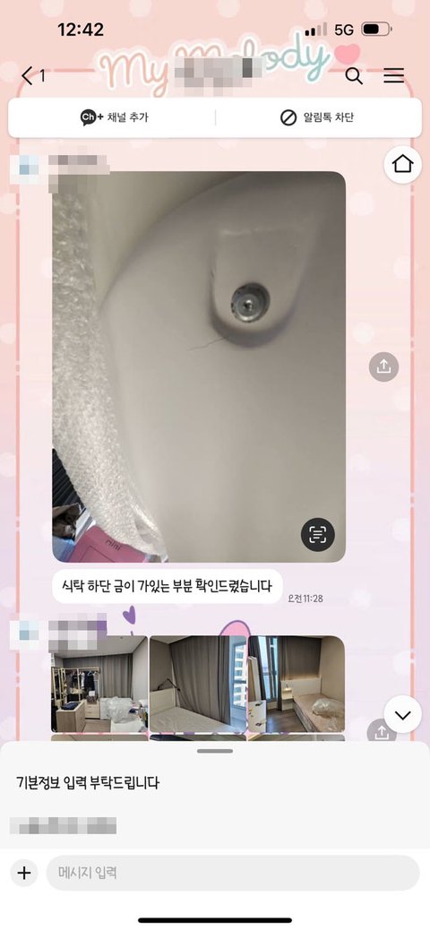 입금하기 전에 우선 파손된 부분을 어떻게 처리를 해주실 건지 물어봤습니다. 그랬더니 사과 한마디 없이 그게 원래 있던 건지 어떤 건지 어떻게 아냐고 하더라고요.