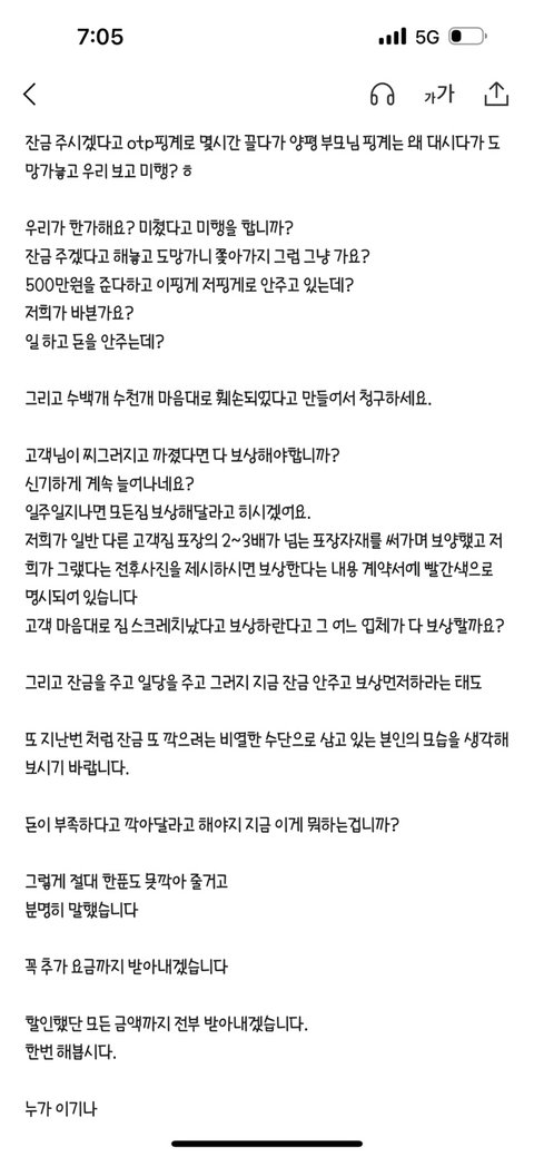직원들이 어제, 오늘 일 못한 부분도 전부 청구한다고 합니다.저희 이사 온 집 등기부등본까지 첨부해가며 보내더라고요 그리고선 잔금 깎으려는 비열한 수단이라며, 차라리 돈 부족하다고 깎아달라 하지 뭐 하는 짓이냐며 모멸감을 주더라고요.