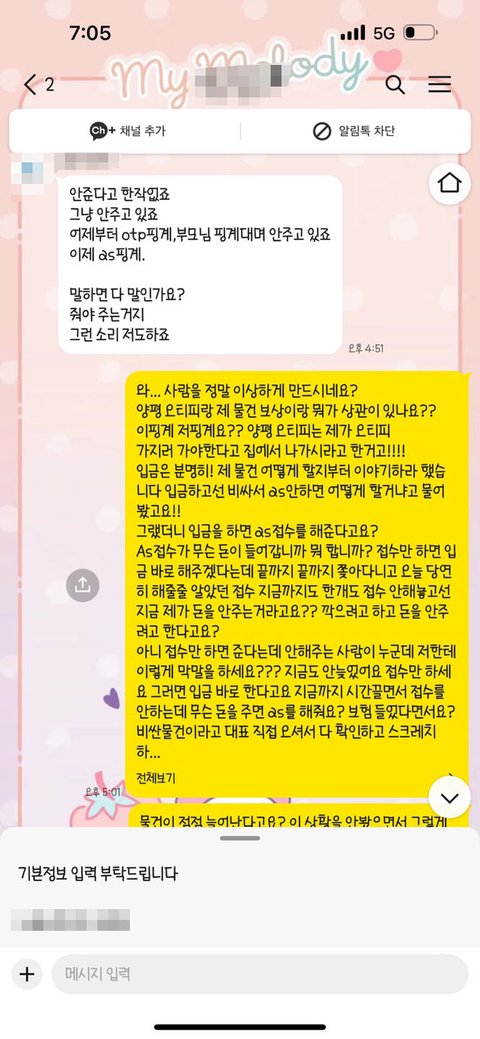저는 계속해서 명확하게 물건이 상했으니 어떤 식으로 해결되는 거냐 물어보고 제가 원하는 부분은 as라고 이야기했고 접수를 해달라고 했습니다 아무래도 고가 물건이고 매번 말이 바뀌는 상황이라 상한 물건에 대한 접수부터가 먼저라고 생각했습니다. 고가 물건이라 보험 든다고 추가요금까지 청구를 하고 대표가 직접 와서 상태까지 다 확인한 물건을 입금 먼저 해야지 as 접수를 해주겠다고 합니다. 계속해서 시간을 버릴 수 없었고 집에서 나가지 않고 계속 지켜보며 있으니 무언갈 할 수 있는 상황도 아니고, 지속적으로 나가달라고 요구했는데도 나가질 않아서 부모님 집에 오티피 가지고 와야 한다고 집을 나가니 본인도 쫓아 오겠다며 계속 따라오기 시작했습니다