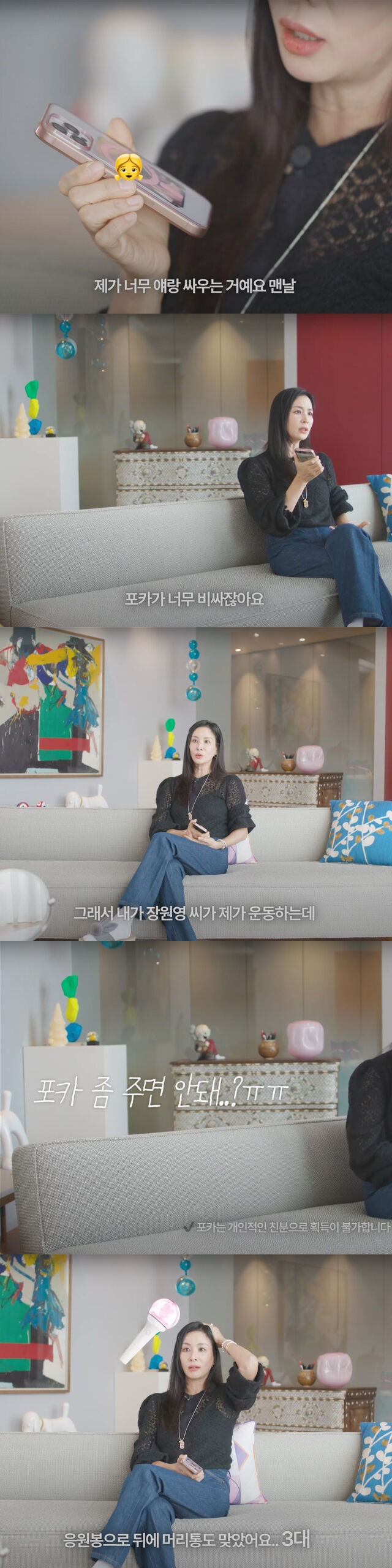 그룹 아이브의 팬인 딸과의 일화를 공개해 '현실 엄마'의 삶을 보여줬다. /유튜브 채널 '바로 그 고소영' 캡처영상 속 그는 딸과의 유쾌한 일상을 전했다. 포토카드(이하 포카) 수집에 진심인 딸 덕분에 운동 중 마주친 장원영에게 "포카 좀 주면 안 되냐"고 말했던 일화를 소개하며 웃음을 안겼다. "아이브 공연은 세 번이나 함께 다녀왔고 응원봉에 머리도 맞아봤다"고 털어놓으며 현실 엄마 면모를 드러냈다. 또한 블랙핑크 콘서트에선 로제가 인사를 건네자 딸이 단번에 로제 팬이 됐다며 아이와의 즐거운 추억을 전했다.