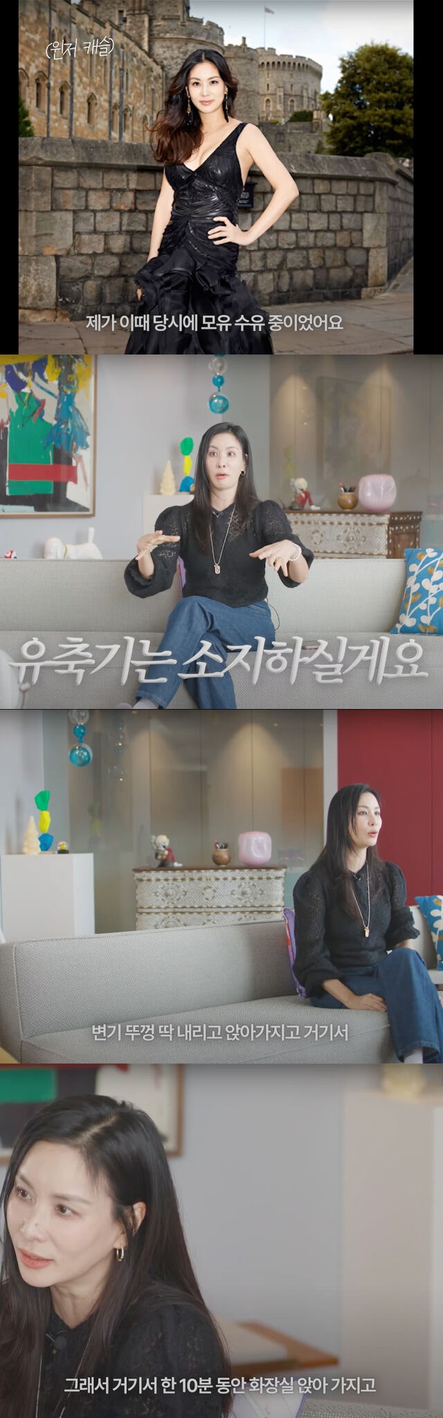 여러 유명 인사들이 모인 행사 자리에서 유축기를 갖고 갈 수밖에 없었던 이야기를 전했다. /유튜브 채널 '바로 그 고소영' 캡처유방암 캠페인 참여로 방문한 윈저 캐슬에 유축기를 들고 간 사연도 공개했다. "보안상 소지품 반입이 제한돼 있었다. 그러나 모유 수유 중이라 유축기를 챙겨갔다. 화장실 변기에 앉아 10분간 유축했다"고 털어놨다.