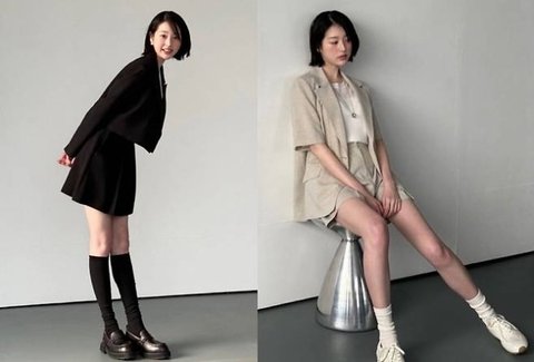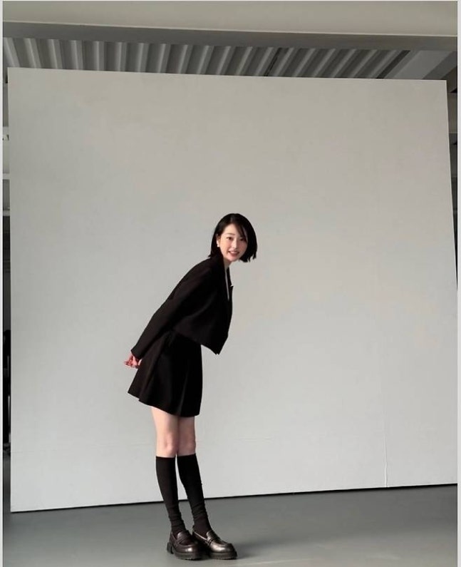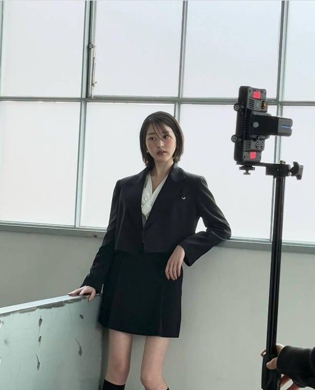 먼저 블랙 미니 슈트 셋업에 무릎까지 올라오는 니삭스를 매치한 룩에서는 시크하면서도 당당한 매력을 드러냈다. 각진 어깨 라인의 재킷과 클래식한 셔츠가 어우러지며 단순한 ‘하이틴룩’을 넘어 세련된 오피스 감성을 더했다.