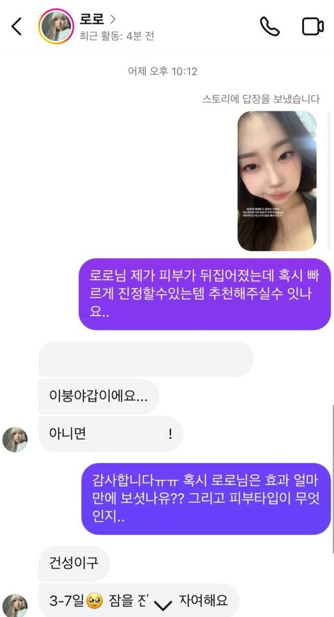혹시 하는 마음으로 도로로한테 피부진정템 추천 해줄수 있냐하니깐 1시간쯤 뒤에 답장와서 제품 추천해줌