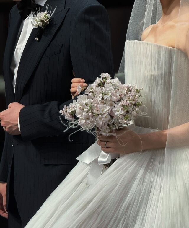 그룹 티아라 효민/효민 소셜미디어효민과 신랑이 나란히 서 있는 클로즈업도 눈길을 끈다. 신랑은 세련된 스트라이프 블랙 턱시도를 착용, 흰색 부토니에로 단정하게 포인트를 장식했다. 우아하게 베일을 쓴 효민은 벚꽃 부케를 들고 '벚꽃웨딩'의 정점을 찍었다.