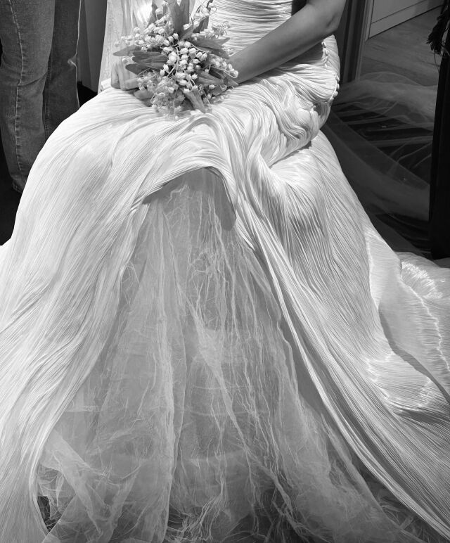 그룹 티아라 효민/효민 소셜미디어공개된 사진에는 마치 동화 속 한 장면 같은 효민의 결혼식 현장이 담겼다. 양 쪽으로 펼쳐진 흐드러진 벚꽃나무 터널이 마치 효민을 위한 꽃길처럼 보인다. 천장에는 고급스러운 샹들리에가 반짝여 화려함을 더한다. 효민은 국내 단 두 벌뿐인 2025 S/S 사라므라드 하이엔드 웨딩드레스를 착용, 벚꽃의 정령처럼 신비롭고 우아한 자태를 뽐내고 있다.