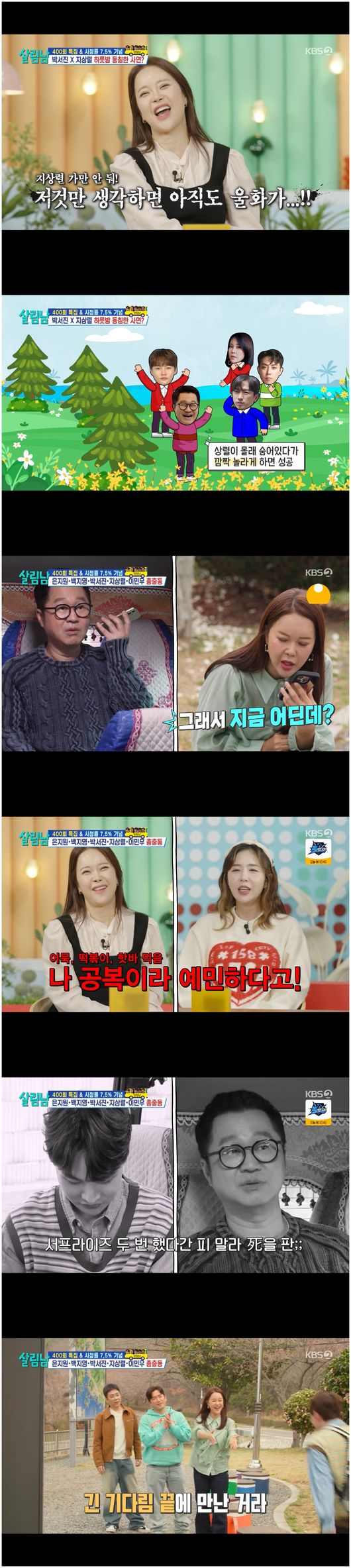 지상렬은 “은지원, 백지영, 이민우가 오기 전에 지상렬이 못 온 걸로 하는 깜짝 카메라를 하자”라며 박서진에게 제안했다. 백지영은 “이렇게 된 거였구나? 나는 정말 저 날만 생각하면 울화가”라며 VCR을 보던 중 화를 냈다.