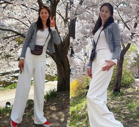 장신영은 슬림한 실루엣의 화이트 니트 탑에 와이드 핏 화이트 데님 팬츠, 그리고 그레이 크롭 가디건을 매치하며 단아하면서도 따뜻한 분위기를 완성했다. 전체적인 톤을 모노톤으로 정리해 세련미를 살리면서도, 레드 컬러의 스니커즈로 룩에 생기와 발랄함을 더해 시선을 사로잡았다.