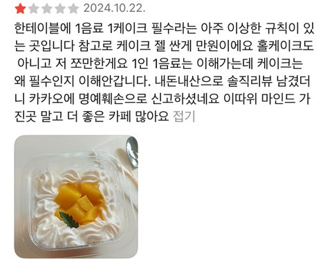1인 1음료 주문에 디저트까지 주문하라는 카페가 몇 곳 있었어요