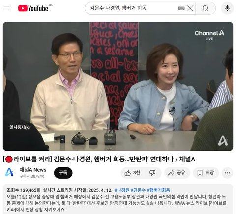 21대 대통령 선거 출마를 선언한 김문수 전 고용노동부 장관과 나경원 국민의힘 의원이 12일 '햄버거 회동'을 갖고 청년·노동 문제 등을 논의했다. 이들은 향후 경선 과정에서의 단일화 가능성을 두고 "국민의힘 어느 후보와도 행보를 같이할 것"이라고 했다.