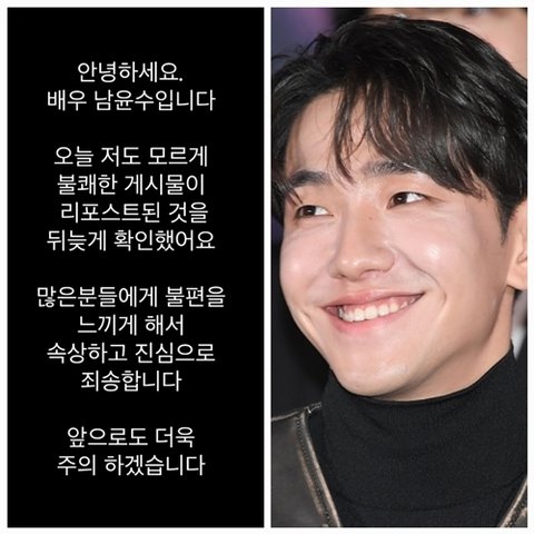 남윤수는 13일 자신의 SNS를 통해 “오늘 나도 모르게 불쾌한 게시물이 리포스트 된 것을 뒤늦게 확인했다”고 말문을 열었다. 이어 “많은 분들에게 불편을 느끼게 해 속상하고 진심으로 죄송하다”며 고개를 숙였다. 그는 “앞으로 더욱 주의하겠다”고 덧붙이며 해당 해프닝에 대해 분명히 사과했다.