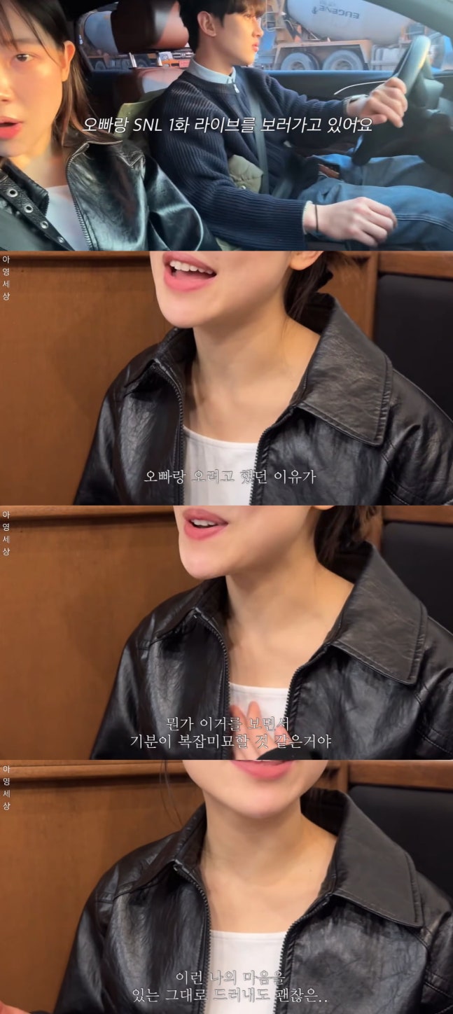 사진=유튜브 채널 '아영세상' 갈무리이어 "오빠와 온 이유는 보면서 기분이 복잡하고 미묘할 것 같아서다"라고 털어놨다. 그는 "이런 나의 마음을 있는 그대로 드러내도 괜찮은"이라더니 "눈물 날 것 같다"며 말을 잇지 못했다. 김아영은 결국 눈물을 흘렸다.