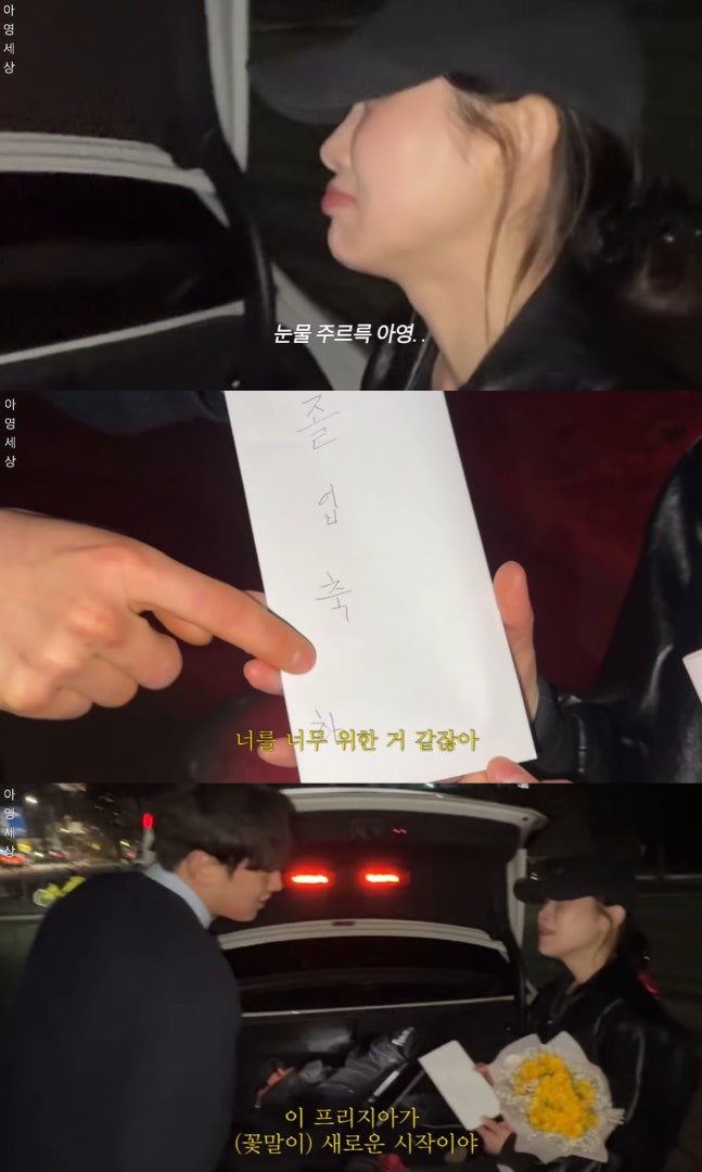 사진=유튜브 채널 '아영세상' 갈무리SNL을 보고 나온 김아영은 MC님를 극찬하며 "열심히 일하시는 건 알았지만, 눈 앞에서 보니까 땀을 많이 흘리시더라"라고 후기를 전했다. 곧 차에 도착한 김아영은 "엄마가 트렁크에서 뭐 가져가라더라"라는 오빠의 말을 듣고 트렁크를 살폈다. 트렁크에는 김아영의 오빠가 준비한 꽃다발과 '졸업 축하'라고 적힌 봉투가 있었다. 봉투를 본 김아영은 "돈은 아니지?"라고 말해 웃음을 자아냈다.