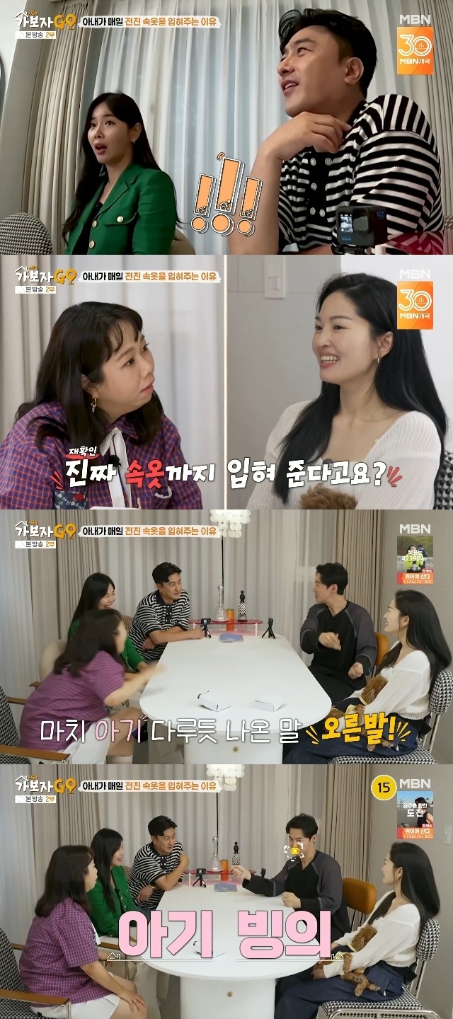 MBN ‘가보자GO 시즌4’ 캡처이날 전진은 류이서가 본인 각질 케어를 해주는 건 물론 "속옷도 입혀 준다"고 밝혔다. 보디로션을 혼자 바르기 힘드니 바르는 걸 도와주면서 "로션을 바르는 와중에 아기처럼 '오른발!'한다. 그게 패턴이 되어 버렸다"는 것. 홍현희는 "내가 우리 아기한테 그렇게 하고 있는데"라며 놀라워했다.