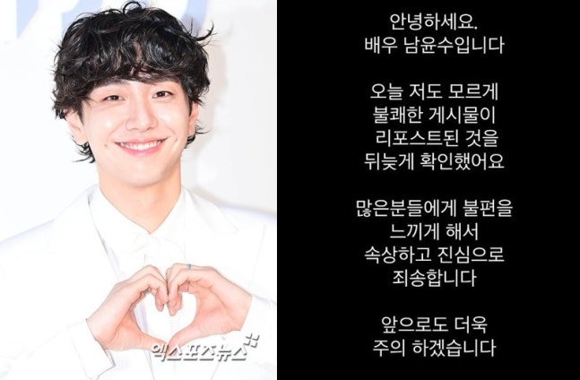 이후 남윤수는 자신의 계정을 19금 해프닝을 정식 사과했다. 그는 "오늘 저도 모르게 불쾌한 게시물이 리포스트된 것을 뒤늦게 확인했다"며 "많은 분들에게 불편을 느끼게 해서 속상하고 진심으로 죄송하다. 앞으로도 더욱 주의하겠다"고 고개를 숙였다.