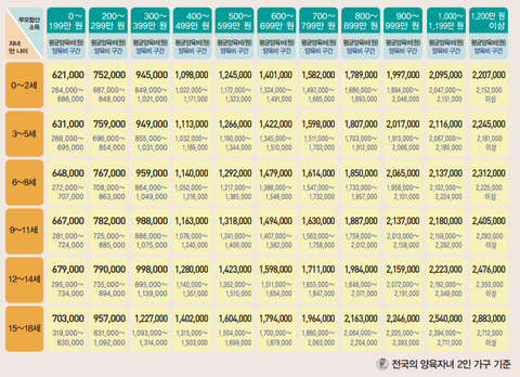 양육비 산정표에서는 최소로 지급해야 하는 돈이 이렇다는거고.. 상대방이 더 주겠다면 더 받아도 되지만.. 더 준다고 싸우고 계시는건 아니겠죠? 돈이 적다고 생각하실 수도 있지만.. 양육은 부모의 공동 책임이기 때문에 키우는 쪽도 양육비에 돈이 들어요. 저 산정표에서 양육비를 받아 쓰고, 추가로 들어가는 돈은 키우는 쪽이 부담한다 생각 하시면 되고요. 우선은 복지로 들어가셔서 받을 수 있는 지원 찾아 보시고 모의 계산도 해보시면서 이혼 후 생계를 어떻게 꾸릴지 계획을 세워 보시는게 어떨까해요.