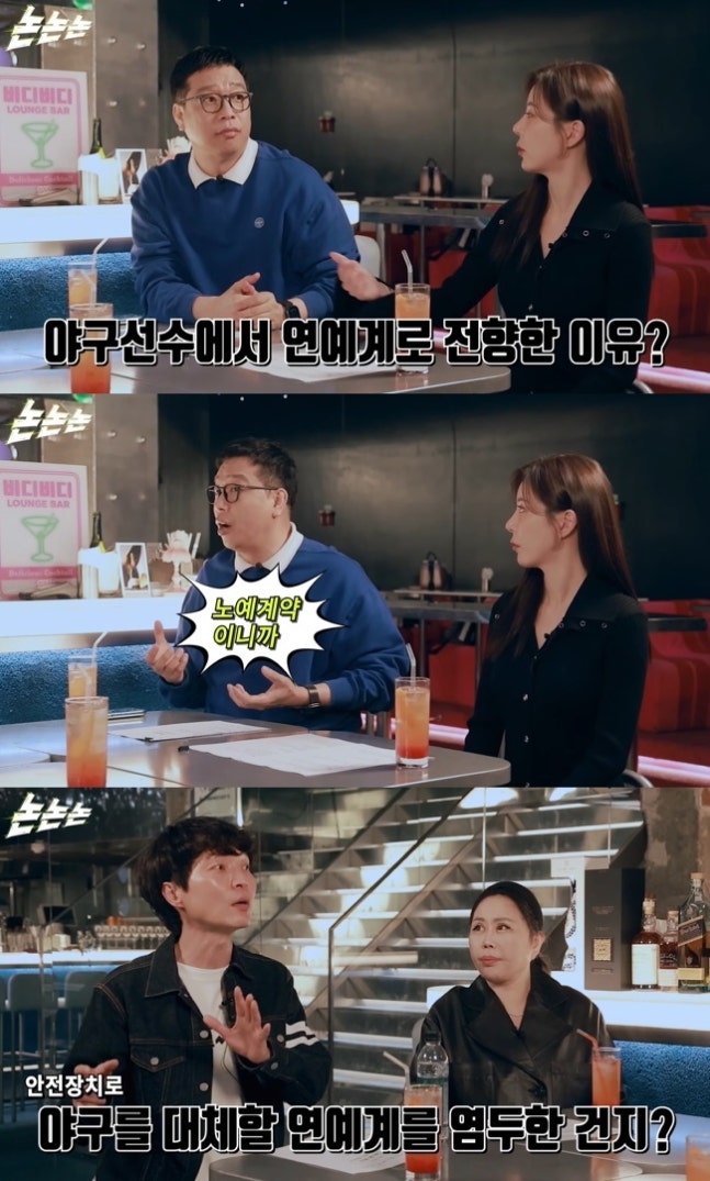 신정환은 “대변인 할 때 야구 인생이 위태롭겠다 생각했을텐데 안전 장치로 연예게를 염두한 건가”라고 물었다.