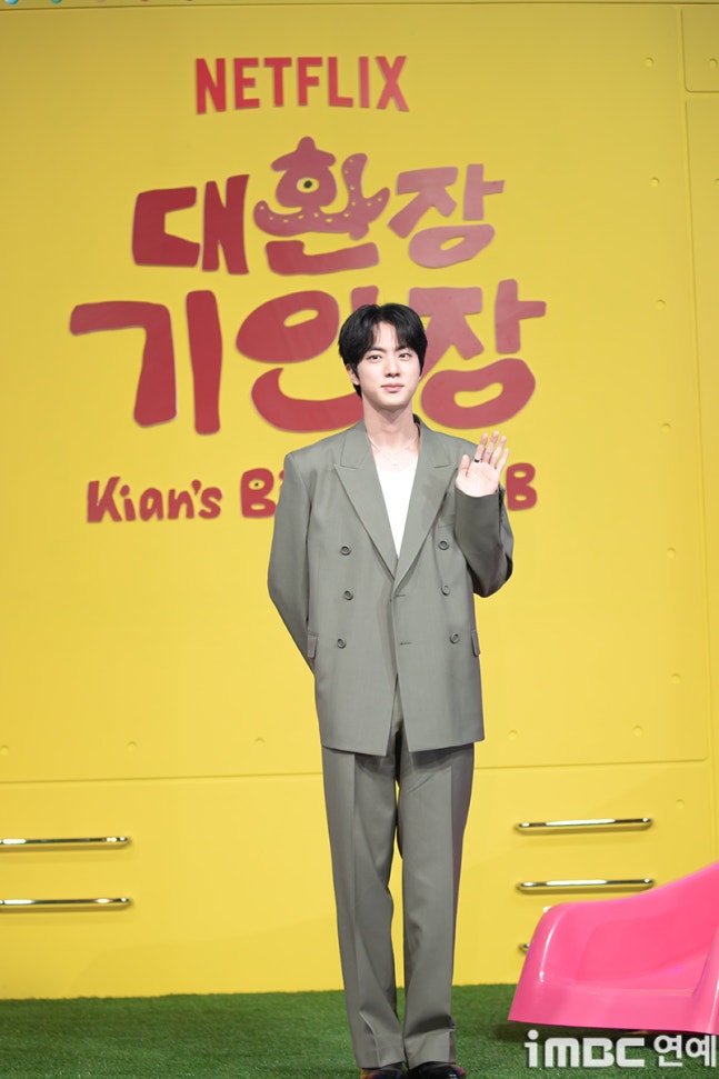 BTS(방탄소년단) 진이 15일 오전 서울 종로구 JW메리어트 동대문 스퀘어에서 열린 넷플릭스 예능 ‘대환장 기안장’ Part 2 ‘절찬리 영업중’ 기자간담회에 참석해 포즈를 취하고 있다.‘대환자 기안장’은 기안적 낭만이 가득한 울릉도 기안장에서 기안84, 진, 지예은이 숙박객들과 펼치는 기상천외한 신개념 민박 버라이어티. 15일 오후 4시 4-6회 공개.