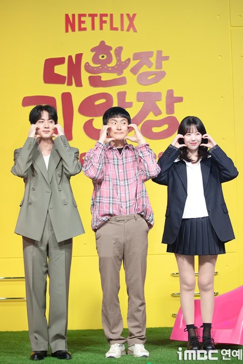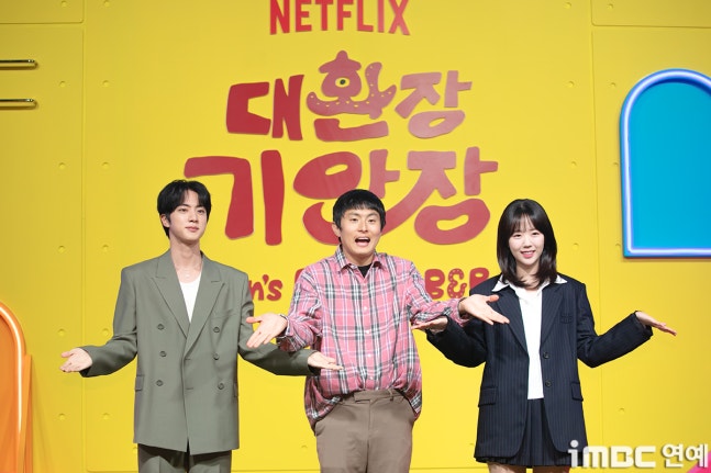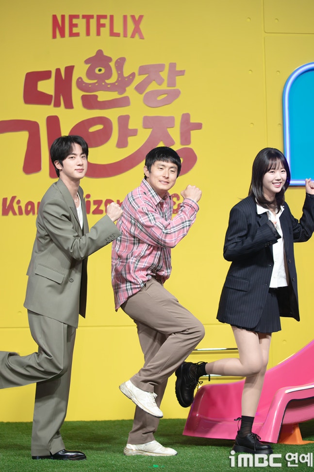 BTS(방탄소년단) 진, 기안84, 지예은이 15일 오전 서울 종로구 JW메리어트 동대문 스퀘어에서 열린 넷플릭스 예능 ‘대환장 기안장’ Part 2 ‘절찬리 영업중’ 기자간담회에 참석해 포즈를 취하고 있다.‘대환자 기안장’은 기안적 낭만이 가득한 울릉도 기안장에서 기안84, 진, 지예은이 숙박객들과 펼치는 기상천외한 신개념 민박 버라이어티. 15일 오후 4시 4-6회 공개.