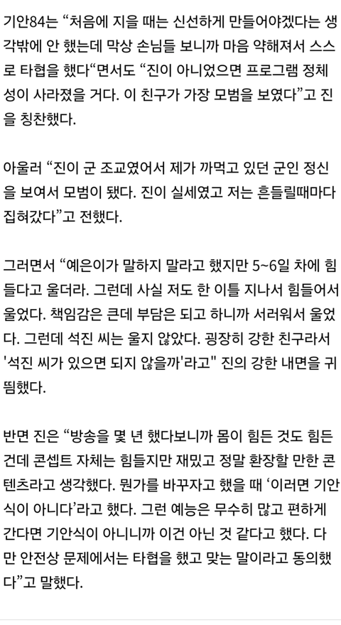 처음 '기안장'을 만들 때 중점을 뒀던 건 '신선함'이었다고 밝힌 기안84는 "그런데 높은 곳에서 매달려서 자는 손님들을 보고 마음이 약해졌다. 스스로 타협을 하게 됐다. 아마 진 씨 아니면 프로그램 정체성이 사라지지 않았을까 싶다"라며 "너무 감사했던 게 있다. 저희가 천장이 없어서 비가 오면 다 맞아야 한다. 근데 진 씨가 비를 다 맞으면서 자고 있더라. '월드 스타인데 누워서 비를 맞으면서 잔다고?'라는 생각이 들었다. 저한테는 왜 들어가서 자냐고 뭐라 하더라"라고 감탄했다.
