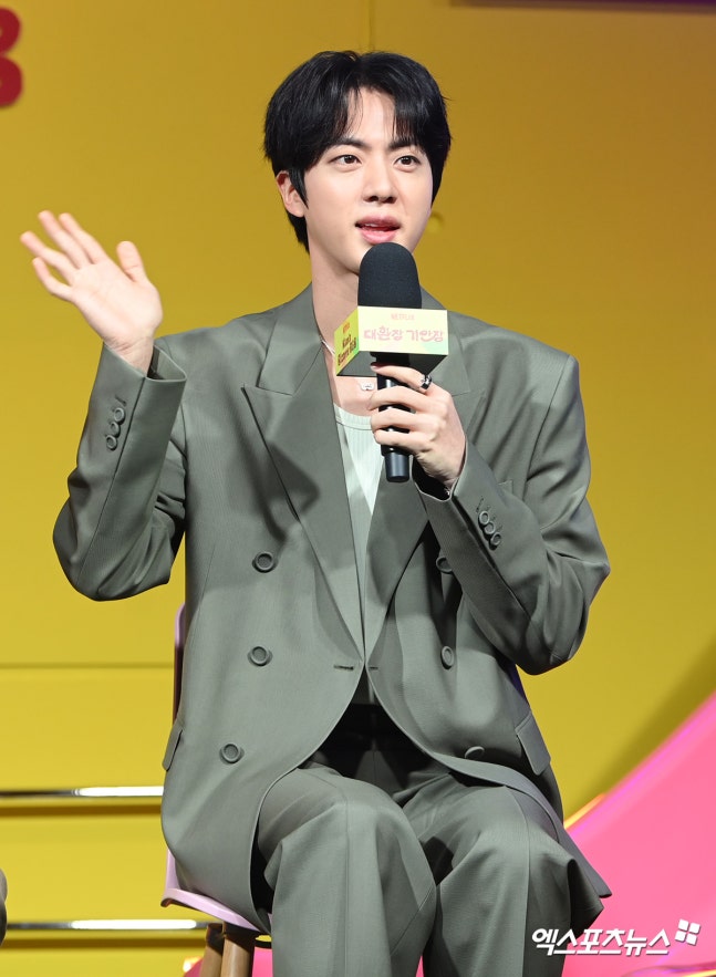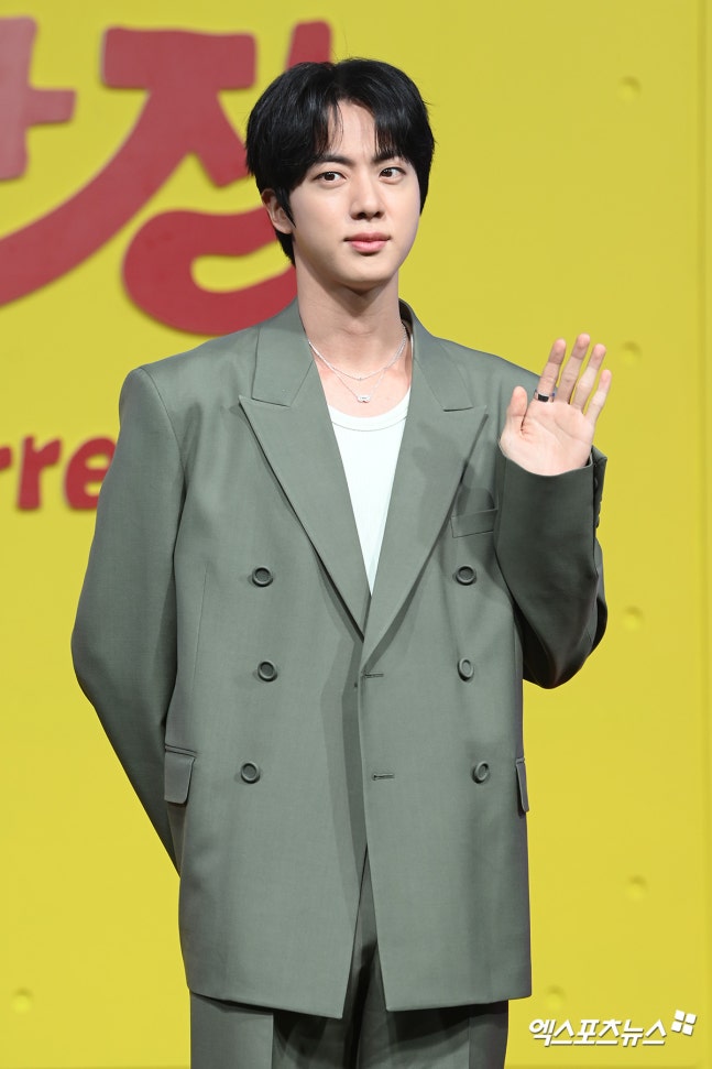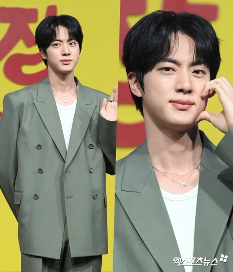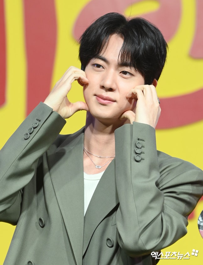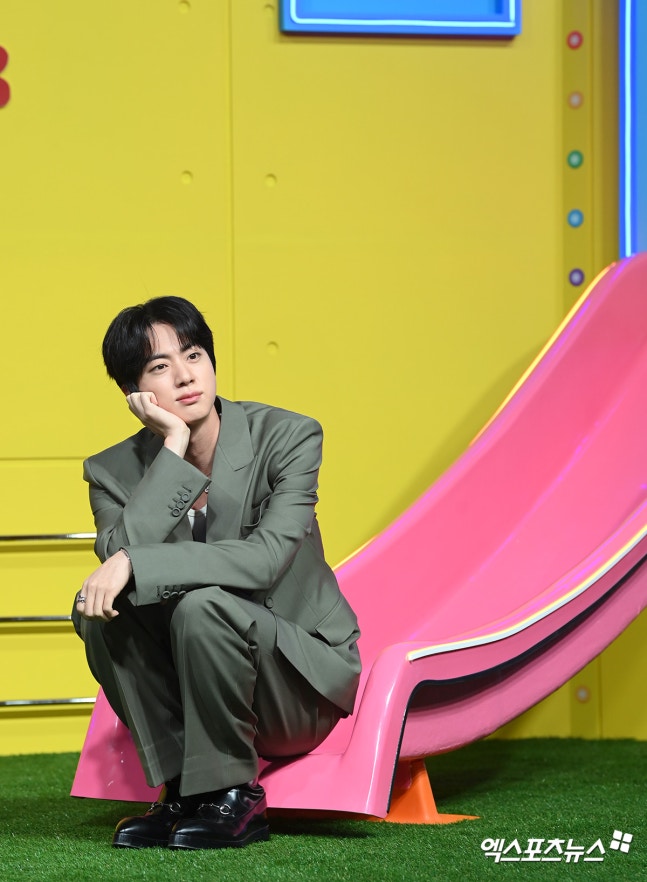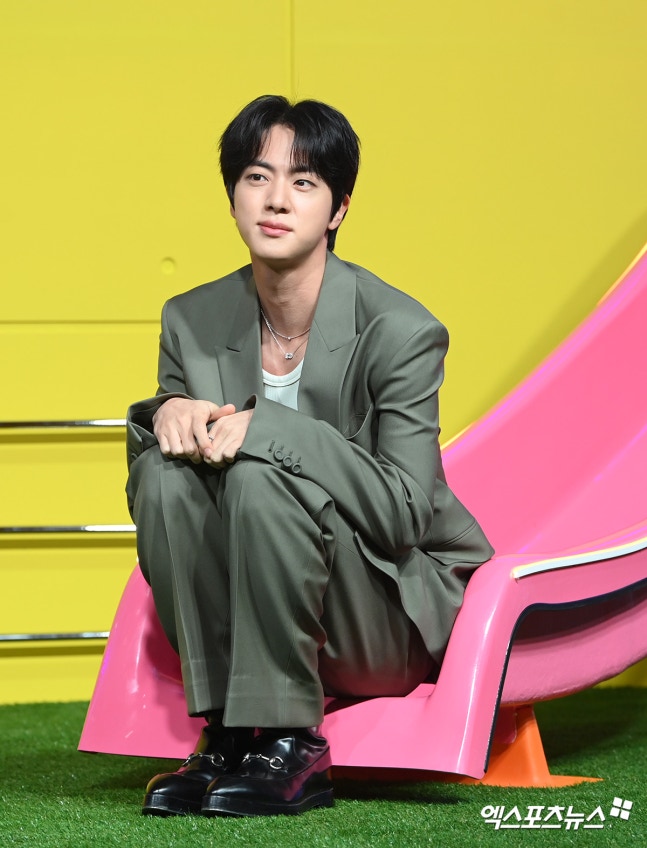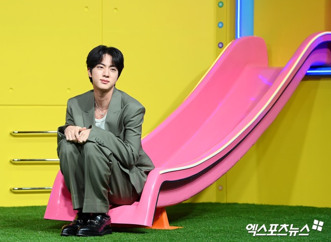 이날 기자간담회에 참석한 방탄소년단(BTS) 진이 포토타임을 갖고 있다.