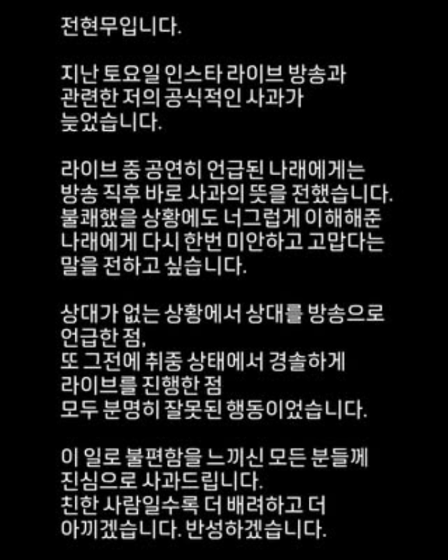 전현무 인스타그램 캡처.그는 “라이브 중 공연히 언급된 나래에게 방송 직후 사과의 뜻을 전했다. 불쾌했을 상황에도 너그럽게 이해해준 나래에게 고맙다”라며 “상대가 없는 상황에서 상대를 방송으로 언급하고 취중 상태에서 경솔하게 라이브를 진행한 점 모두 분명히 잘못된 행동이었다. 불편함을 느낀 모든 분들께 사과드린다. 친한 사람일수록 더 배려하고 더 아끼겠다”며 반성하겠다는 마음을 전했다.