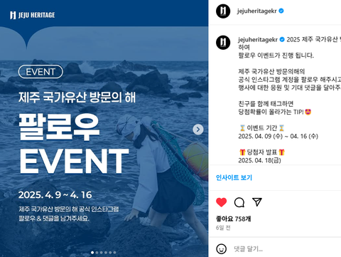 제주 국가유산 방문의해인데팔로우이벤트로는 커피쿠폰 주고 퀴즈는 올영이랑 치킨 깊카 주더라고요한 번 참여해보세여~https://www.instagram.com/jejuheritagekr/