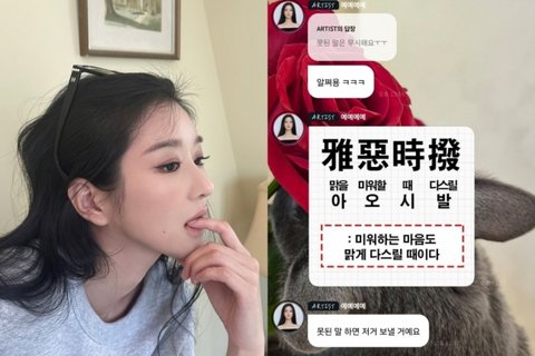이어 '맑을 아(雅), 미워할 오(惡), 때 시(時), 다스릴 발(撥). 미워하는 마음도 맑게 다스릴 때'라는 욕설을 연상케 하는 문구가 담긴 사진을 보냈다. 그러면서 "못된 말 하면 저거 보낼 거예요"라며 귀여운 으름장을 놨다.