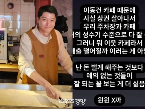 이 카페 사장은 일부 이들이 해당 글을 지적하자 “이동건 카페 때문에 사실 상권 살아나서 우리 주차장과 카페 거의 성수기 수준으로 다 잘 된다. 이웃 카페라서 매출 떨어질까 이러는 게 아니다. 난 돈 벌게 해주는 것보다 예의 없는 것들이 잘 되는 꼴 보는 게 더 싫다”고 했다.
