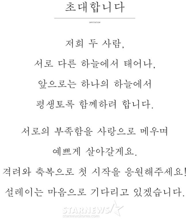 또한 "격려와 축복으로 첫 시작을 응원해주세요. 설레는 마음으로 기다리고 있겠습니다"라며 하객들에게 초대 글을 남겼다. 함께 게재된 초대 영상에는 "서로의 심장이 하나인 것처럼 평생동안 함께하겠습니다"라는 문구와 함께 두 사람의 로맨틱한 웨딩 사진이 담겨 눈길을 끌었다.