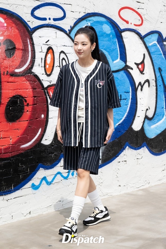 리아는 스트라이프룩으로 멋을 냈다. 깔끔하게 묶어 올린 포니테일 헤어스타일로 인형같은 이목구비를 뽐냈다.