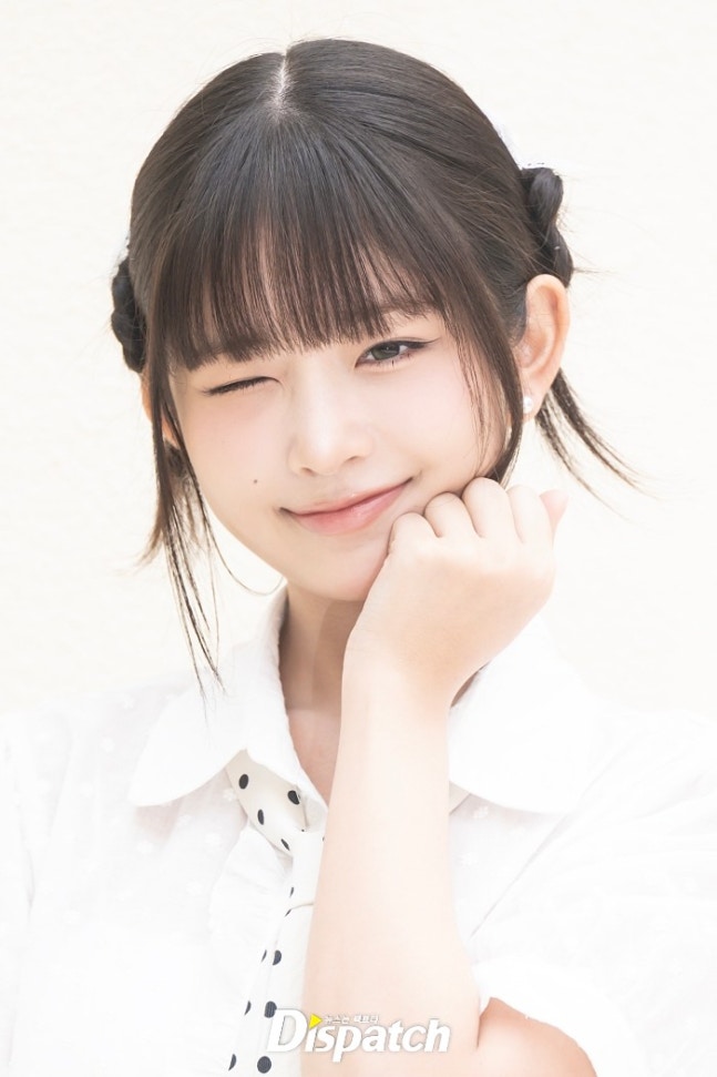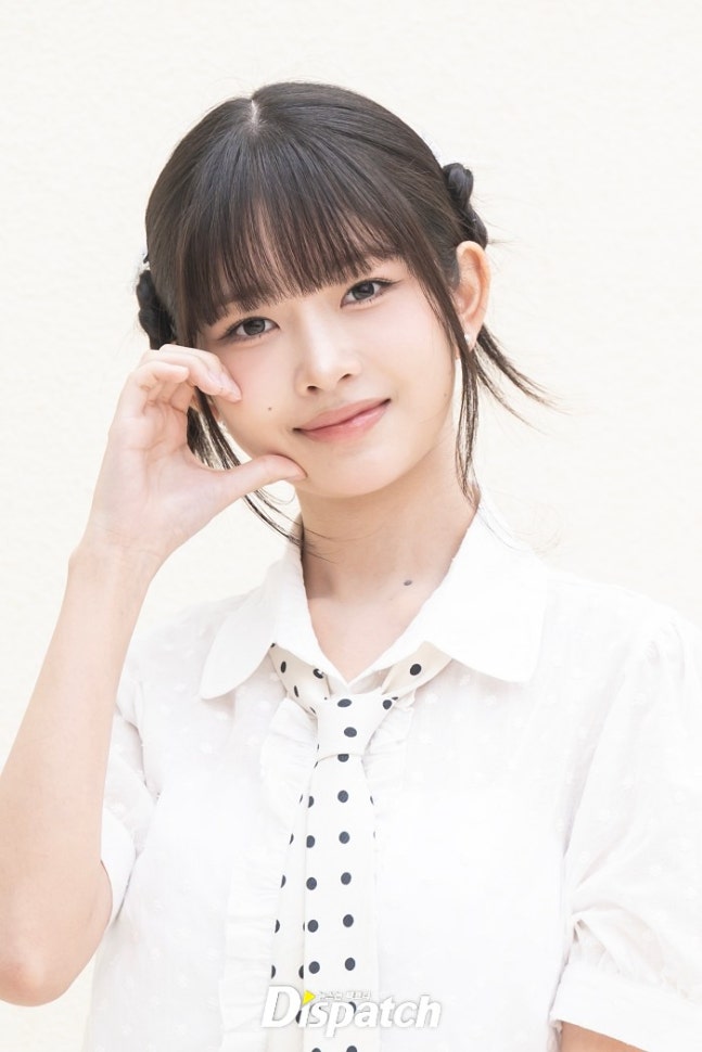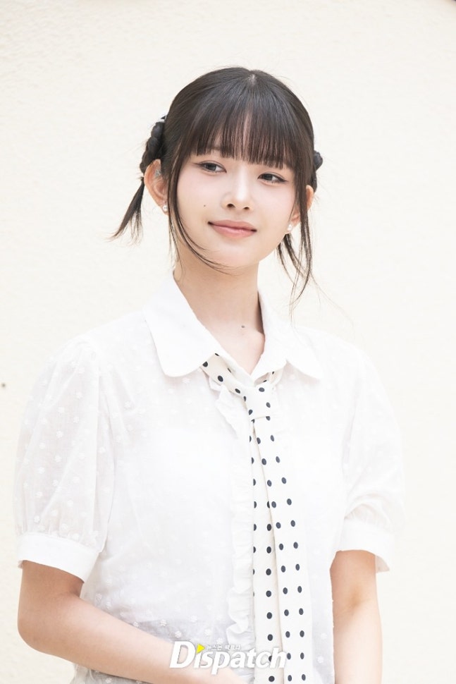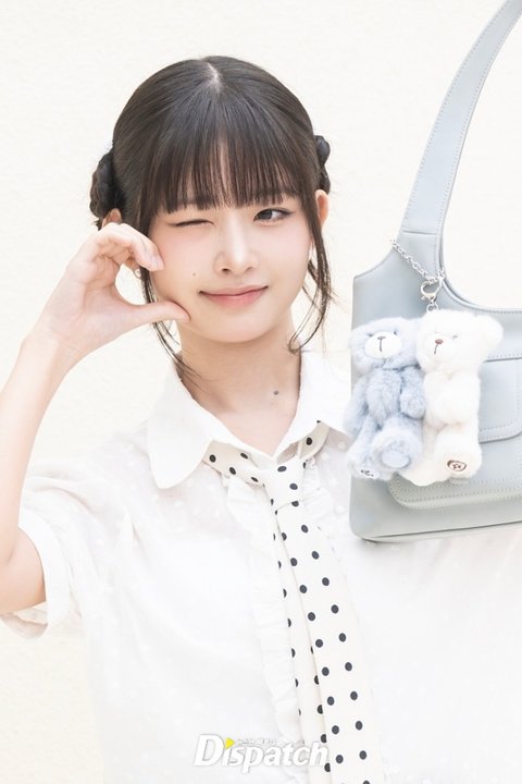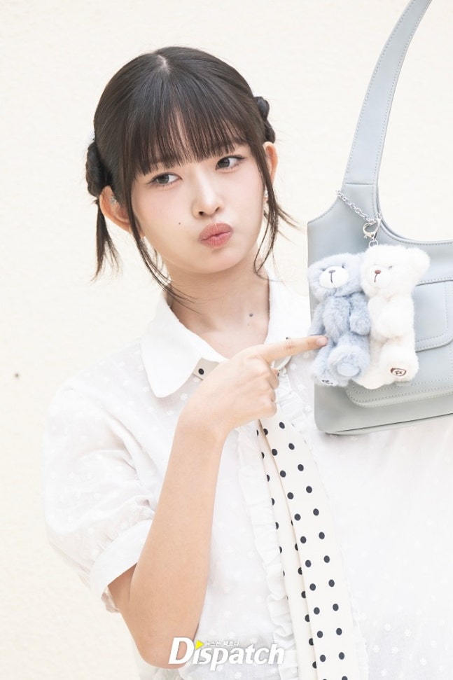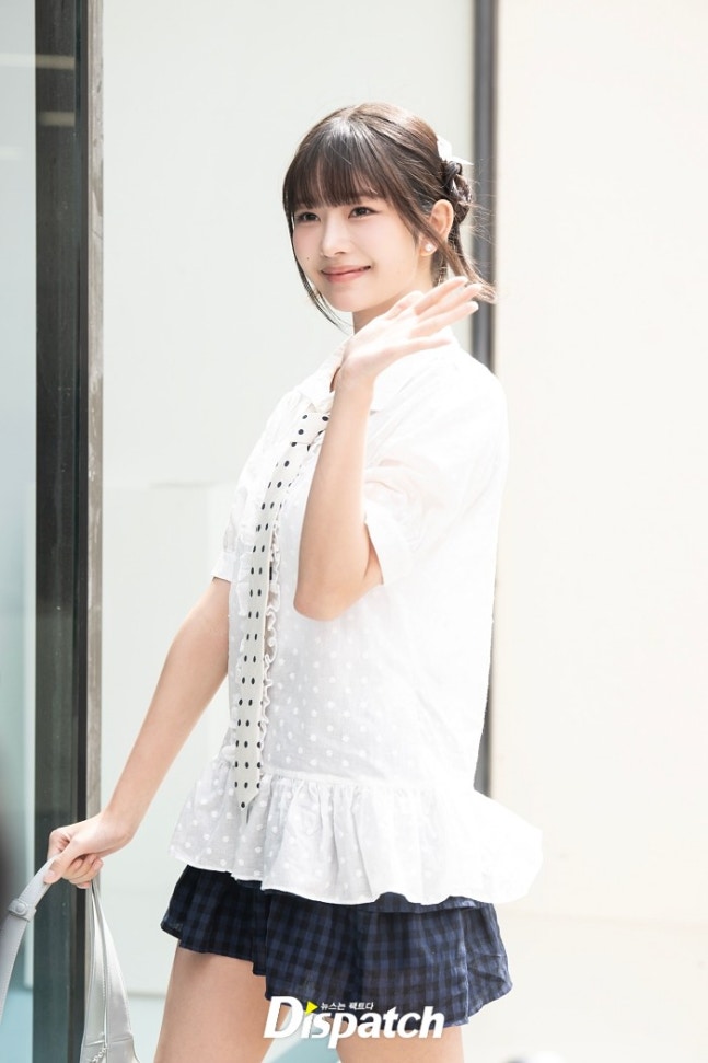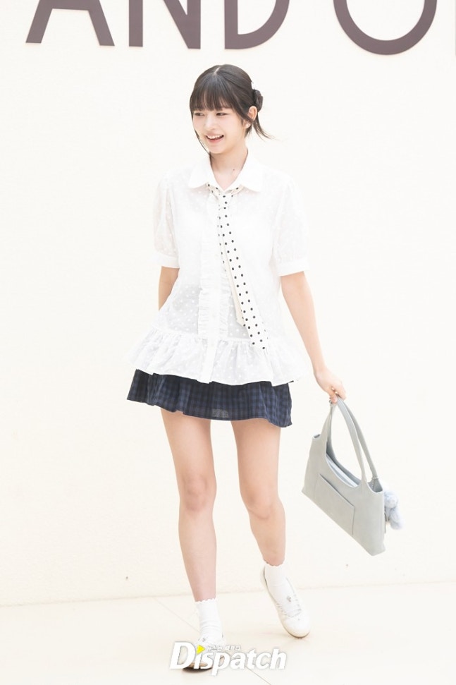 레이는 퍼프소매의 화이트 블라우스와 미니스커트로 멋을 냈다. 인형같은 미모가 돋보였다.