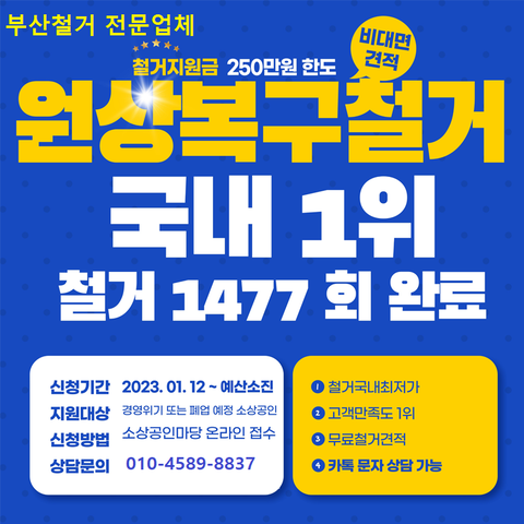 목차부산철거 왜 비용이 많이 들까?부산철거 소상공인이 특히 주목해야 하는 이유소상공인폐업지원금이란?부산철거와 소상공인폐업지원금 연계 방법부산시 원스톱 폐업지원 서비스란?부산철거업체 선택 시 체크리스트신청 절차 및 유의사항마무리: 부산철거, 비용 절감은 정__이다1. 부산철거 왜 비용이 많이 들까?부산철거 작업은 단순히 벽을 부수는 작업이 아닙니다.건축 구조의 안전을 고려한 전문 해체 기술, 각종 폐기물의 합법적 처리, 주변 시설 보호 등 다양한 절차가 포함되어 있습니다. 특히 부산처럼 도심 밀집도가 높은 지역에서는 소음·분진·교통 통제 등 추가 비용이 발생하기 쉬워 부산철거 비용이 전국 평균보다 높게 책정되는 경우가 많습니다.2. 부산철거 소상공인이 특히 주목해야 하는 이유소상공인의 경우, 폐업 결정 이후 원상복구나 임대인과의 계약상 철거 의무를 이행해야 하는 경우가 많습니다. 이때 부산철거 전문 업체를 통한 정밀 해체 작업이 필요하며, 비용이 만만치 않게 들어갑니다.이럴 때 유용하게 활용할 수 있는 것이 바로 소상공인폐업지원금입니다. 특히 부산시는 적극적인 정책을 펼치고 있어 부산철거 비용을 낮출 수 있는 기회입니다.3. 소상공인폐업지원금이란?소상공인폐업지원금은 정부와 지자체가 공동으로 제공하는 정책 자금입니다.경영상의 어려움이나 코로나 이후의 타격 등으로 폐업을 결정한 소상공인에게, 정리 비용 일부를 지원해주는 제도입니다.지원 항목 예시:폐업 철거비 (부산철거업체와 계약된 철거 작업)시설물 철수 및 정리철거 후 원상복구 공사 일부부산에서는 소상공인폐업지원금으로 평균 300만~400만 원을 지원하며, 이를 통해 부산철거 비용의 50~70%를 절감할 수 있습니다.4. 부산철거와 소상공인폐업지원금 연계 방법부산철거 업체를 먼저 선정하고, 폐업지원금을 신청하는 순서로 진행됩니다.순서 요약:폐업 신고 및 사업자 폐업 증명서 발급부산철거 전문 업체와 철거 계약 체결소상공인시장진흥공단 또는 부산시 중소기업 지원기관에 지원금 신청철거 후 증빙자료 제출 (견적서, 세금계산서, 사진 등)심사 후 지원금 지급이때 부산철거 업체가 폐업지원금 관련 서류 작성에 협조적인지도 꼭 확인해야 합니다.5. 부산시 원스톱 폐업지원 서비스란?부산시는 폐업 과정에서 소상공인이 겪는 복잡한 절차를 간소화하기 위해 원스톱 폐업지원 서비스를 운영 중입니다.포함 항목:폐업 절차 안내부산철거 연계 업체 추천소상공인폐업지원금 신청 대행재창업, 재취업 교육 연계부산철거를 고려하는 소상공인에게 매우 실질적인 도움이 되며, 특히 초보 폐업자에게 추천되는 프로그램입니다.6. 부산철거업체 선택 시 체크리스트부산철거를 맡기기 전, 다음 사항을 반드시 확인하세요:정식 사업자 등록 여부건축물 철거 관련 보험 가입 여부소상공인폐업지원금 연계 경험 유무세금계산서 및 폐기물 처리 확인서 발급 가능 여부부산철거 후기 및 실적 확인이 조건을 충족하는 합법적이고 신뢰할 수 있는 부산철거 업체를 선택하면, 지원금 수령도 훨씬 원활하게 이뤄집니다.7. 신청 절차 및 유의사항소상공인폐업지원금 신청 시 준비물:폐업 신고서철거 계약서 (부산철거 업체 명시)철거 전후 사진세금계산서통장 사본✔️ 유의사항:철거 전에 미리 신청해야 승인 확률이 높아집니다.부산철거 견적이 과다할 경우 일부 비용은 제외될 수 있습니다.중복 지원 금지: 다른 정부사업과 겹치지 않도록 주의!8. 마무리: 부산철거, 비용 절감은 정__이다폐업은 쉬운 결정이 아닙니다. 하지만 결정했다면, 부산철거 업체 선정부터 소상공인폐업지원금 신청까지 체계적으로 진행하는 것이 중요합니다.부산시의 다양한 제도를 잘 활용하면, 부산철거 비용 부담을 최소화하고, 새로운 출발을 위한 자금도 마련할 수 있습니다.부산철거는 단순한 공사가 아닙니다. 이는 재기의 시작점이 될 수 있습니다.정보가 돈입니다. 제도는 준비된 자에게만 기회를 줍니다.