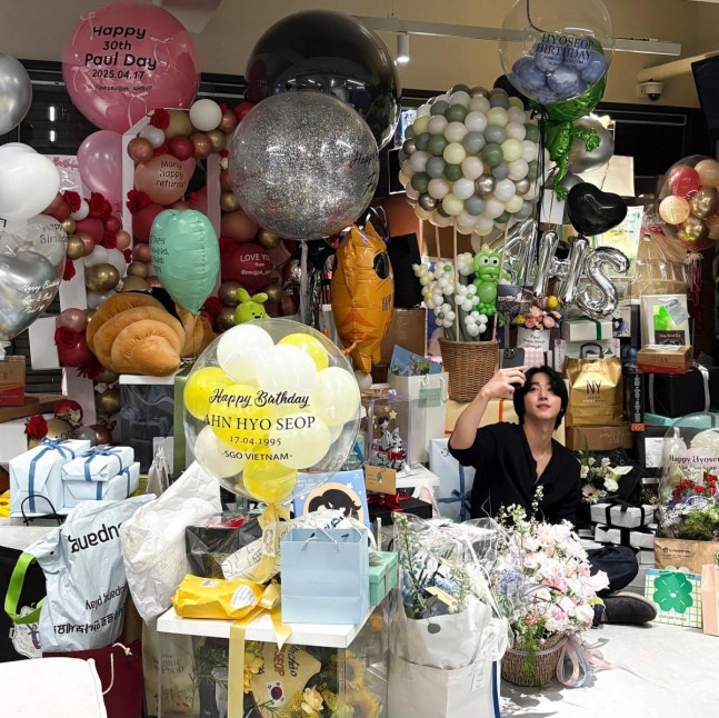 안효섭은 17일 자신의 SNS에 “생일+근황 모음.zip”이라는 글과 함께 여러 장의 사진을 게재했다. 공개된 사진 속 안효섭은 수많은 선물과 풍선, 꽃다발에 둘러싸인 채 환한 미소를 짓고 있다. 다른 컷에서는 회색 나시 차림으로 거울 셀카를 찍으며 운동으로 다져진 탄탄한 피지컬을 뽐내 팬들의 이목을 사로잡았다.