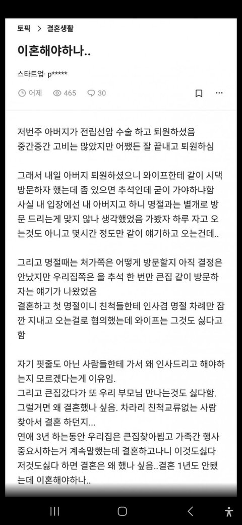 입장 바꿔 내 엄마가 수술하고 퇴원했는데 남편이 곧 명절인데 뭐하러가 하고 말하면 이혼하자 할 거 같음. 퉤